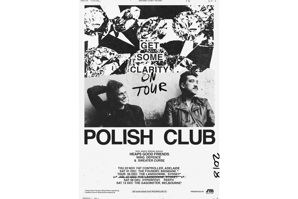 Polish ClubIn addition to being two of the funniest dudes on the market, Sydney rock pairing Polish Club are one of the best at what they do, whether it's on their debut album - last year's Alright Already - or Clarity, an absolute epic of a single that packed their energetic, guitar-driven sound into a four-minute explosion of energy that marked their first single from album number two - expected sometime next year. They're also one of the best we have when it comes to their live show, something they'll be showing in person as they haul themselves around the country in a pre-Xmas national run supported by Heaps Good Friends, Sweater Curse and Wing Defence (more deets at the end of this article).